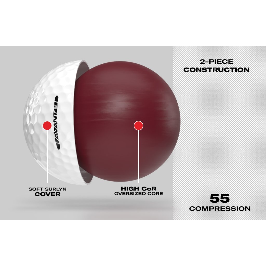 Ideální rovnováha mezi trajektorií a kontrolou. Měkký povrch z materiálu Surlyn s 392 dimply pro optimální trajektorii a hratelnost. AVANT 55 využívá technologii SoftCell k dosažení ultra nízké komprese 55. Vysoký koeficient odpružení (CoR) jádra generuje maximální rychlost míčku. Ideální pro hráče s nižší a střední rychlostí švihu . Dvoudílná konstrukce umožňuje vysoké odpaly s wedgemi a velmi měkký pocit kolem greenů a při puttování.