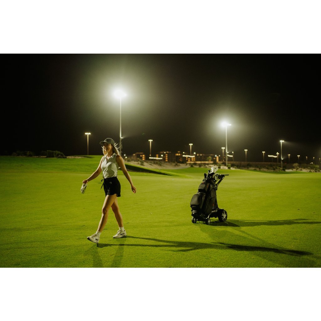 Nejkompaktnější vozík nové generace Stewart Golf Q Follow černý, s kapacitou baterie 36 jamek, doplněný o cestovní tašku Stewart Golf a luxusní golfový cartbag Stewart.